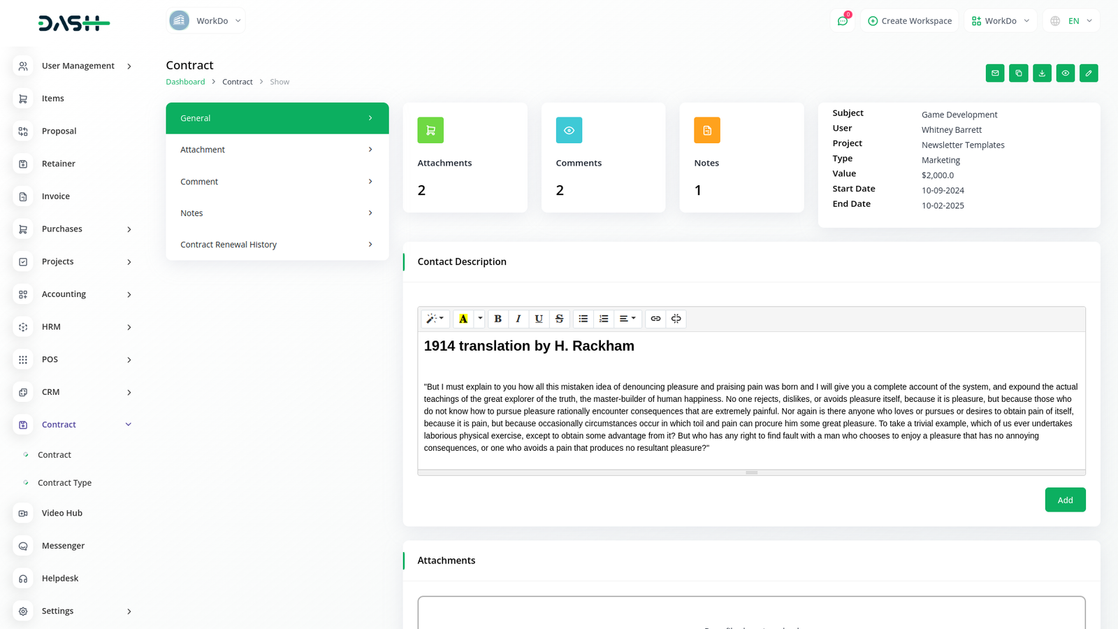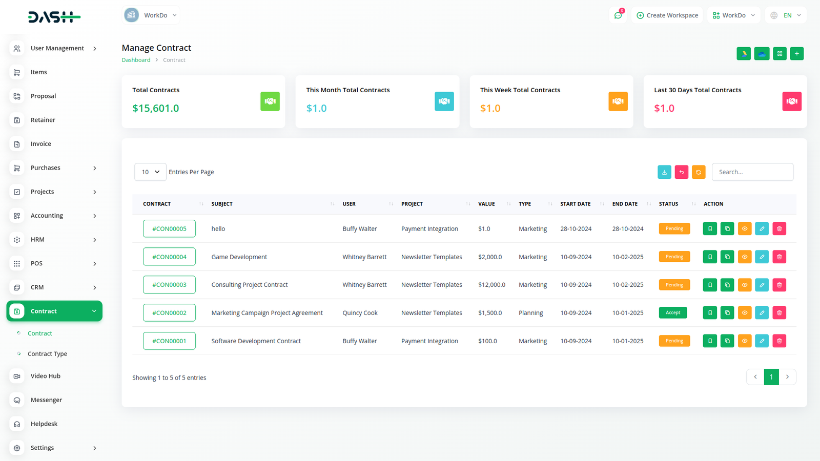 Contract Module is very helpful for proper documentation of the contracts done with clients showing the type of contract, the value, and time duration. The predefined settings can be done/ updated through Setup.