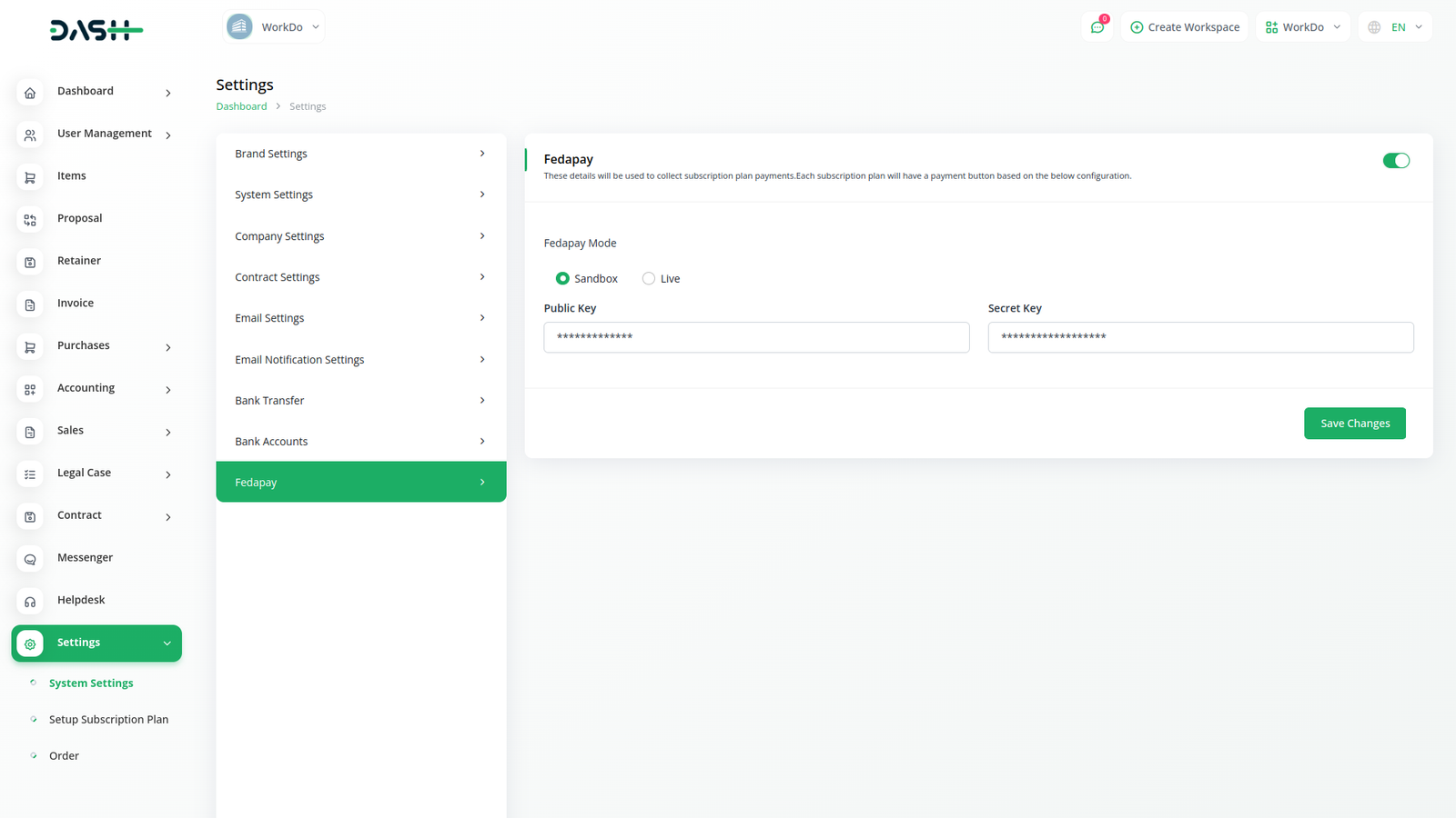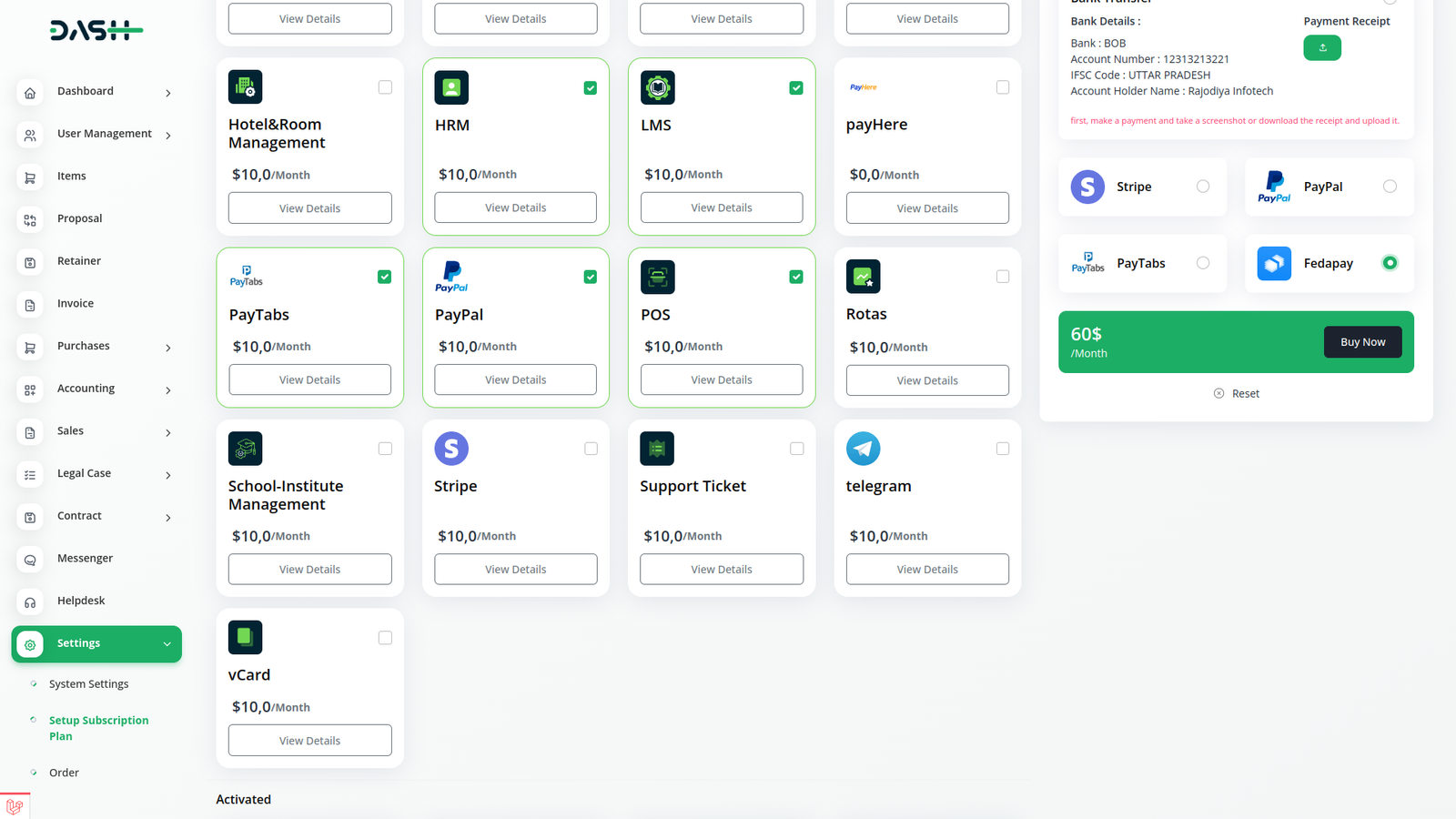 Streamline your invoicing and plan payment processes within Dash SaaS with the power of FedaPay Integration. FedaPay robust features enable you to effortlessly manage invoices and accept payments for subscription plans, facilitating smoother transactions and improved cash flow management. Experience enhanced efficiency and convenience in handling your billing processes, allowing you to focus on growing your business.